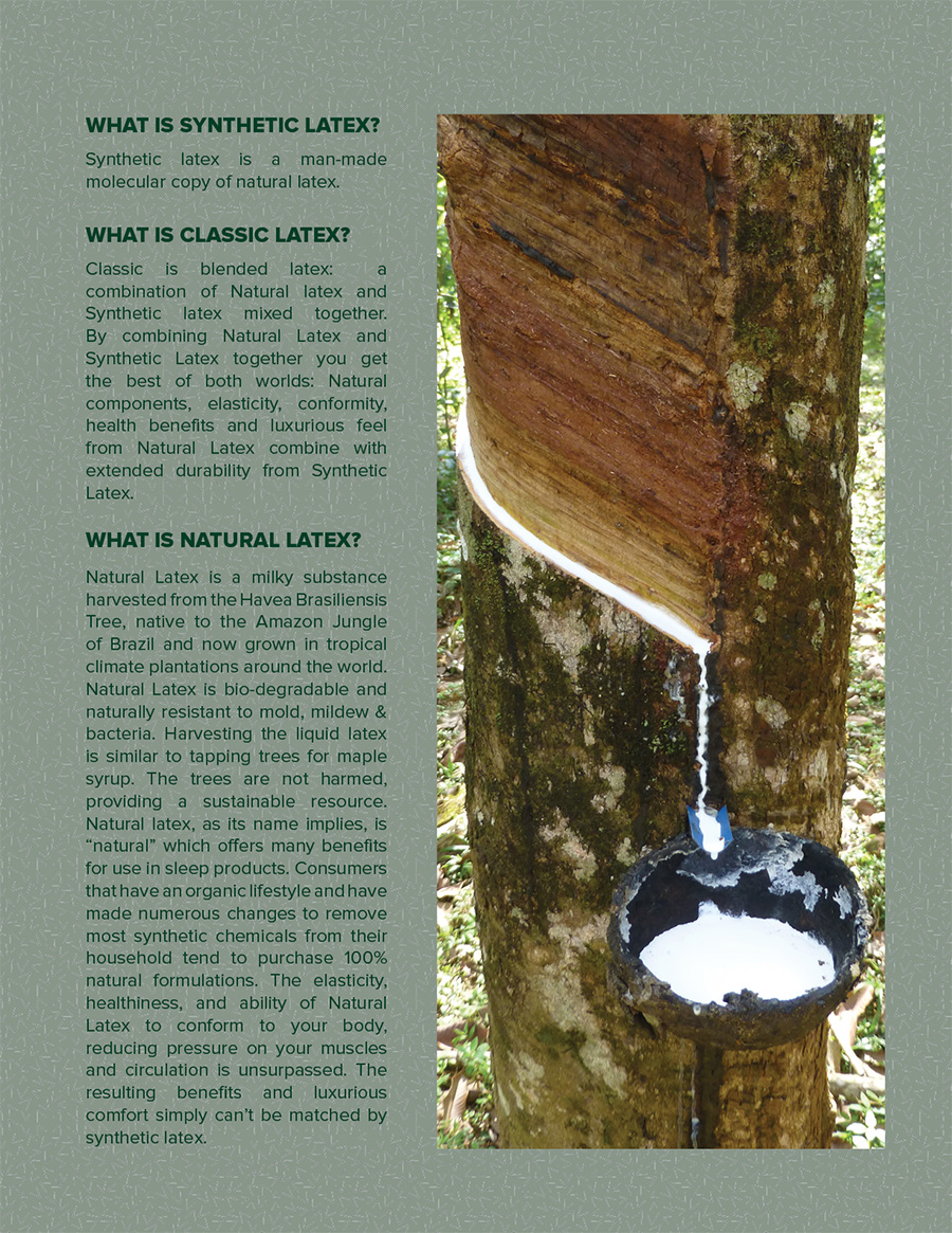NATURAL LatexNatural Latex, as its name implies, is €œnatural€ which offers many benefits for use in sleep products. Consumers that have an organic lifestyle and have made numerous changes to remove most synthetic chemicals from their household tend to purchase 100% natural formulations. The elasticity, healthiness, and ability of Natural Latex to conform to your body, reducing pressure on your muscles and circulation is unsurpassed. The resulting benefits and luxurious comfort simply cant be matched by synthetic Latex. However, because it is a €œnatural€ product there are inconsistencies at the molecular level which cause Natural Latex products to wear at a faster rate than Synthetic Latex. |